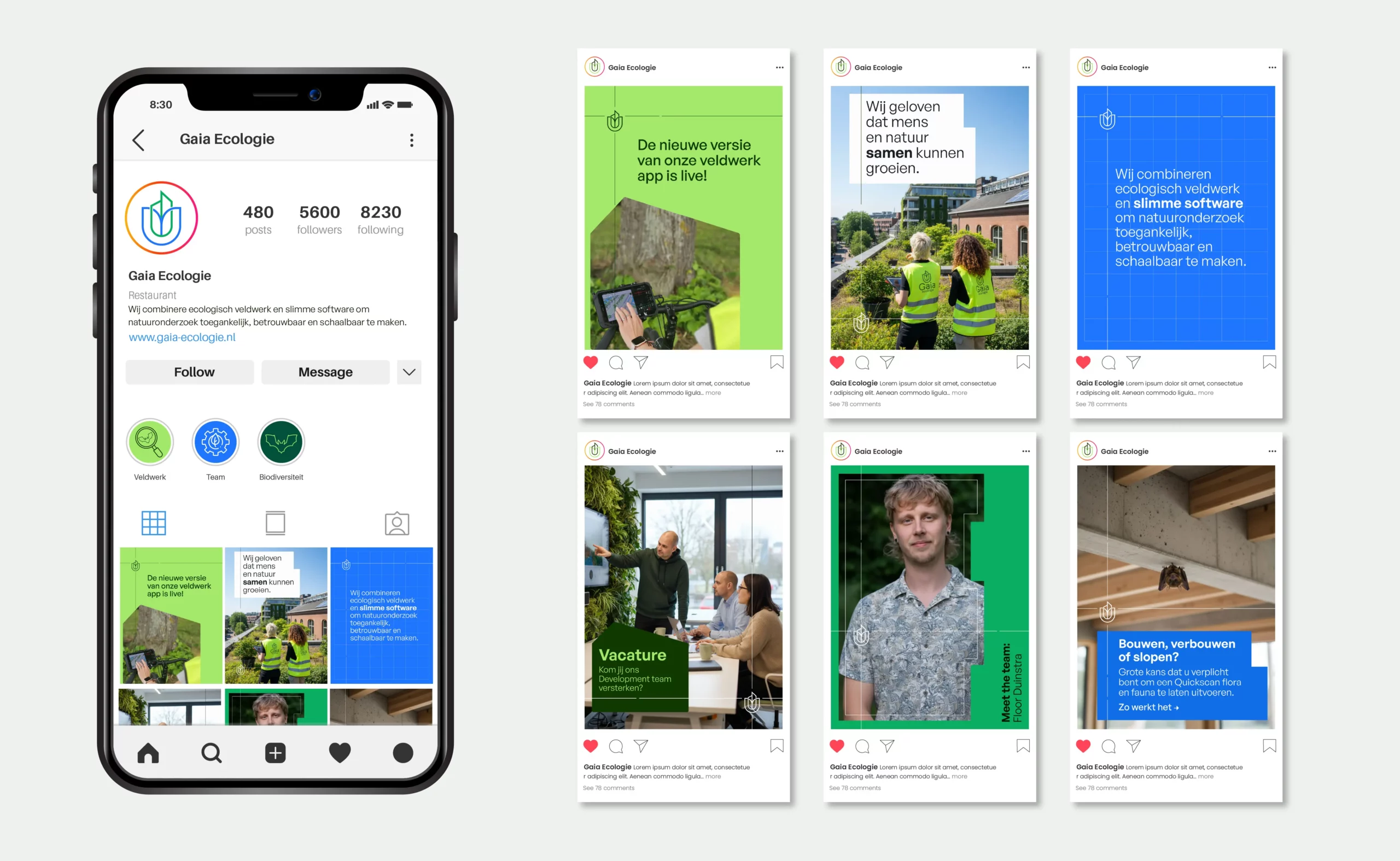 Voor Gaia Ecologie had ik de uitdaging om een visuele identiteit te ontwikkelen die past bij hun missie: bouwen aan een wereld waarin mens en natuur samen groeien. Anders dan veel ecologiebedrijven onderscheidt Gaia zich met een eigen ontwikkelde portal. In de nieuwe stijl wilden we daarom de combinatie van natuur en technologie samenbrengen.